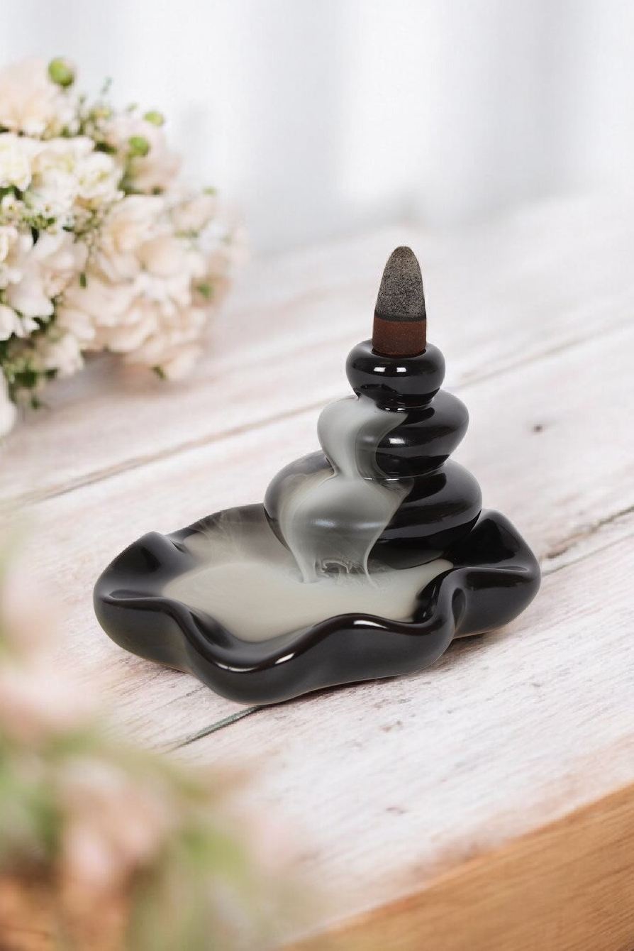 Ce porte-encens à refoulement (backflow) en forme de galets empilés diffuse la fumée en douce cascade descendante, pour un effet visuel apaisant. Son design noir mat épuré en fait une pièce idéale pour la méditation, le yoga ou la relaxation à la maison.