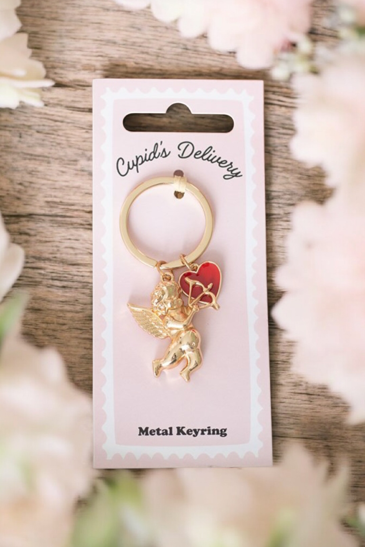 Petit porte‑clés romantique avec pendentif Cupidon ailé et cœur, parfait pour offrir ou pour décorer un sac / trousseau de clés.