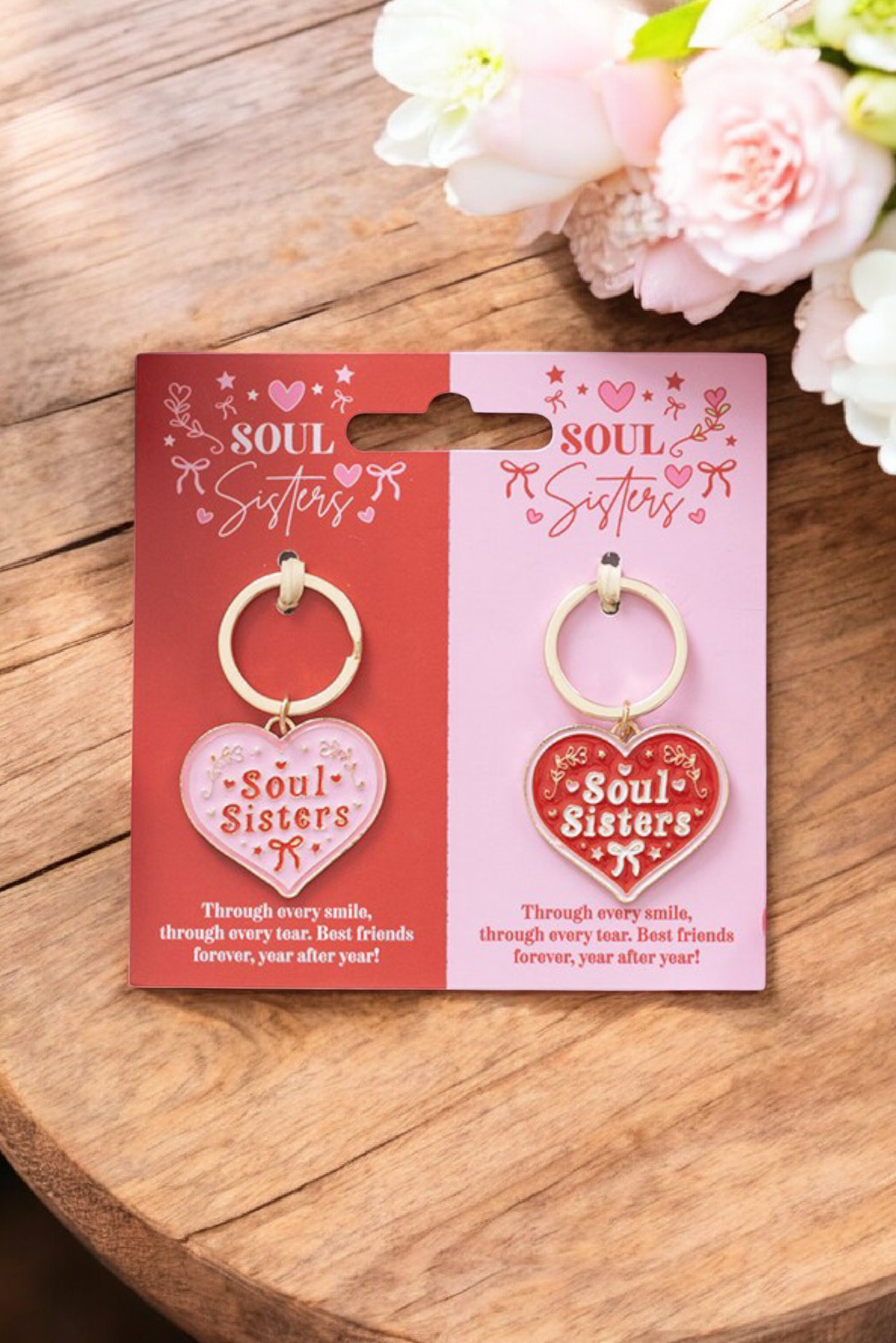 Set de 2 porte-clés assortis en forme de cœur, l’un rose et l’autre rouge, parfaits pour meilleures amies ou sœurs de cœur.