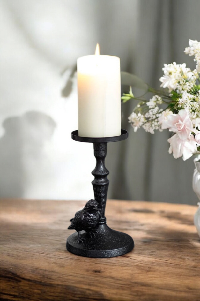 Bougeoir en résine noire avec grand corbeau perché sur un socle façon bougeoir ancien, parfait pour une déco mystique ou chambre gothique.